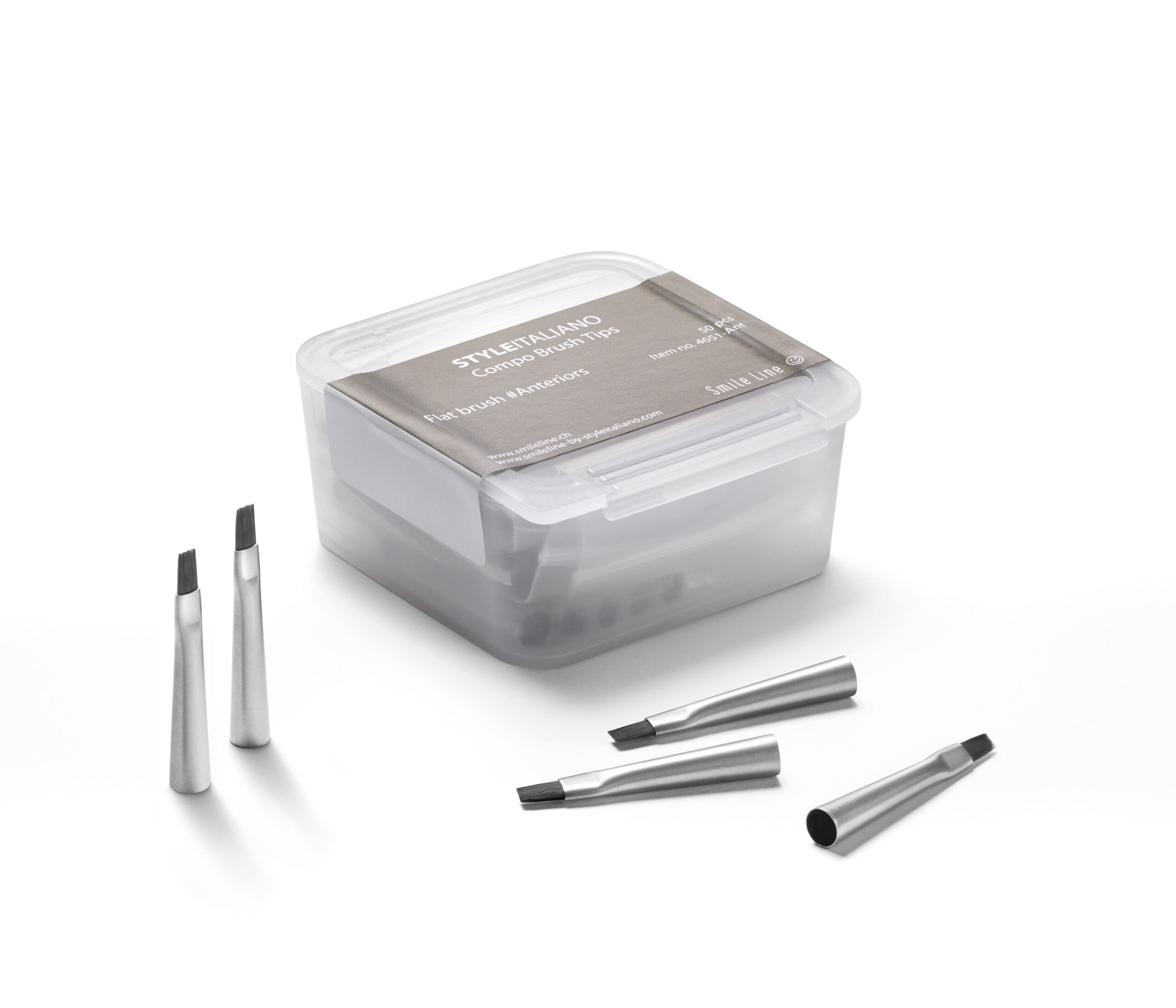 Styleitaliano ile geliştirilen Compo-Brushes, kompozit şekillendirme için tasarlanmıştır. Siyah sentetik elyafları, en iyi kontrastla aşırı hassasiyet sağlar. Normalde kompozit kitlerde bulduğunuz standart fırçalardan daha üstün bir çalışma kalitesi. Fırça uçları, saplarında tak çıkar şekli ile tutulur. Posterior fırça ucu, arka bölgelere daha iyi erişim için kullanıcı tarafından kolayca bükülebilir. Compo-Brush seti, her model için iki tam fırça ve iki yedek fırça ucu içerir. Tekli fırçalar ve fırça uçları yedekleri ayrı olarak mevcuttur.