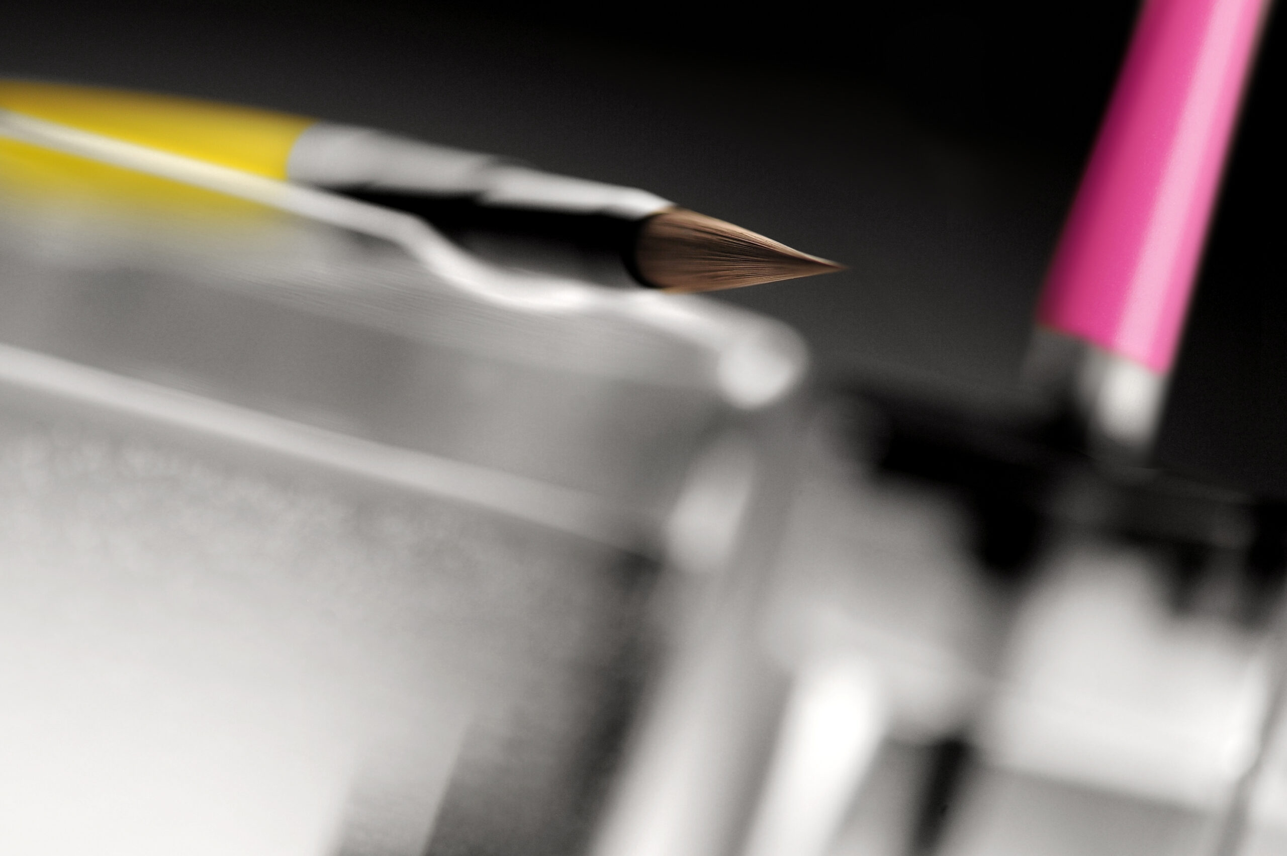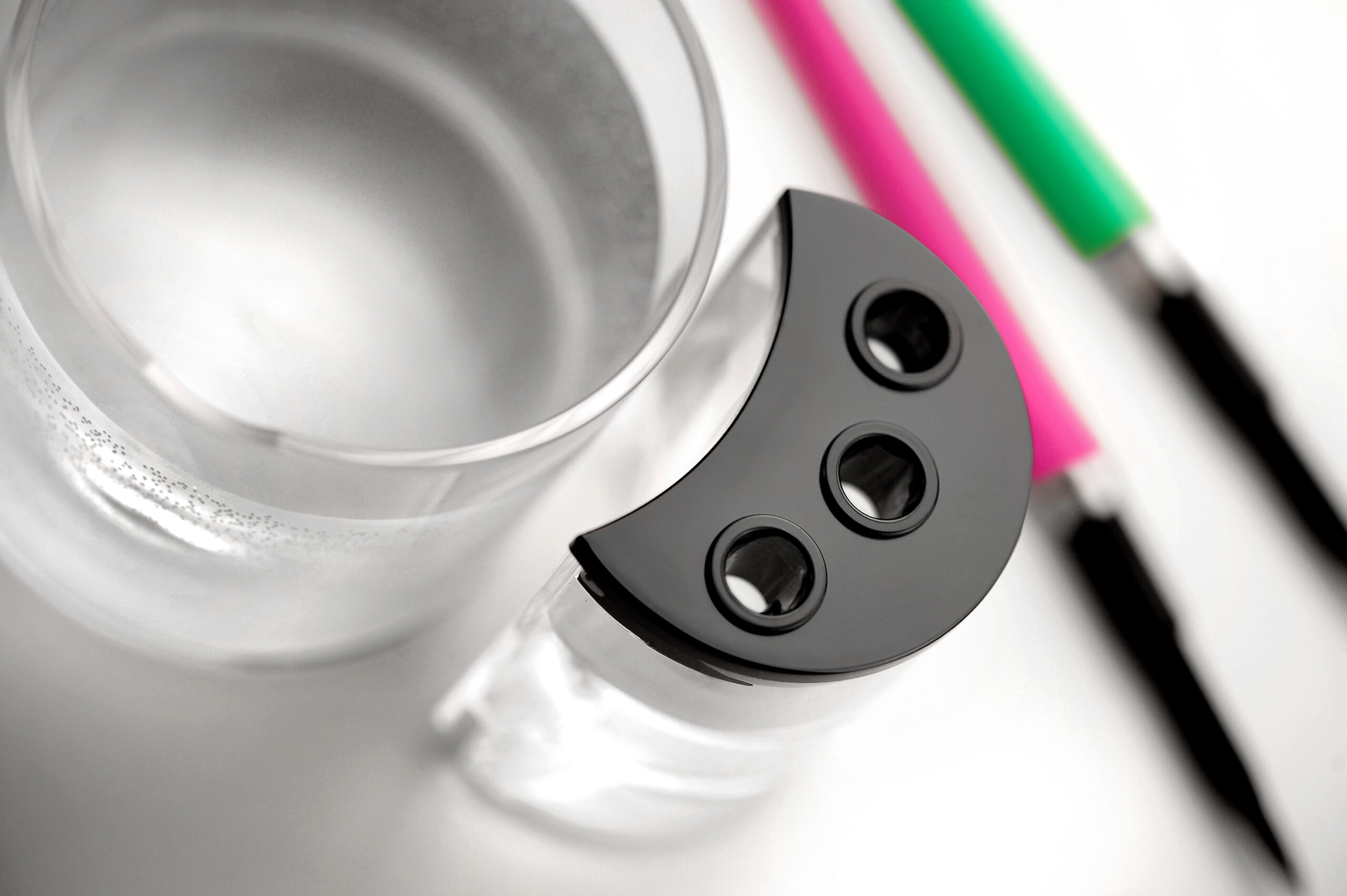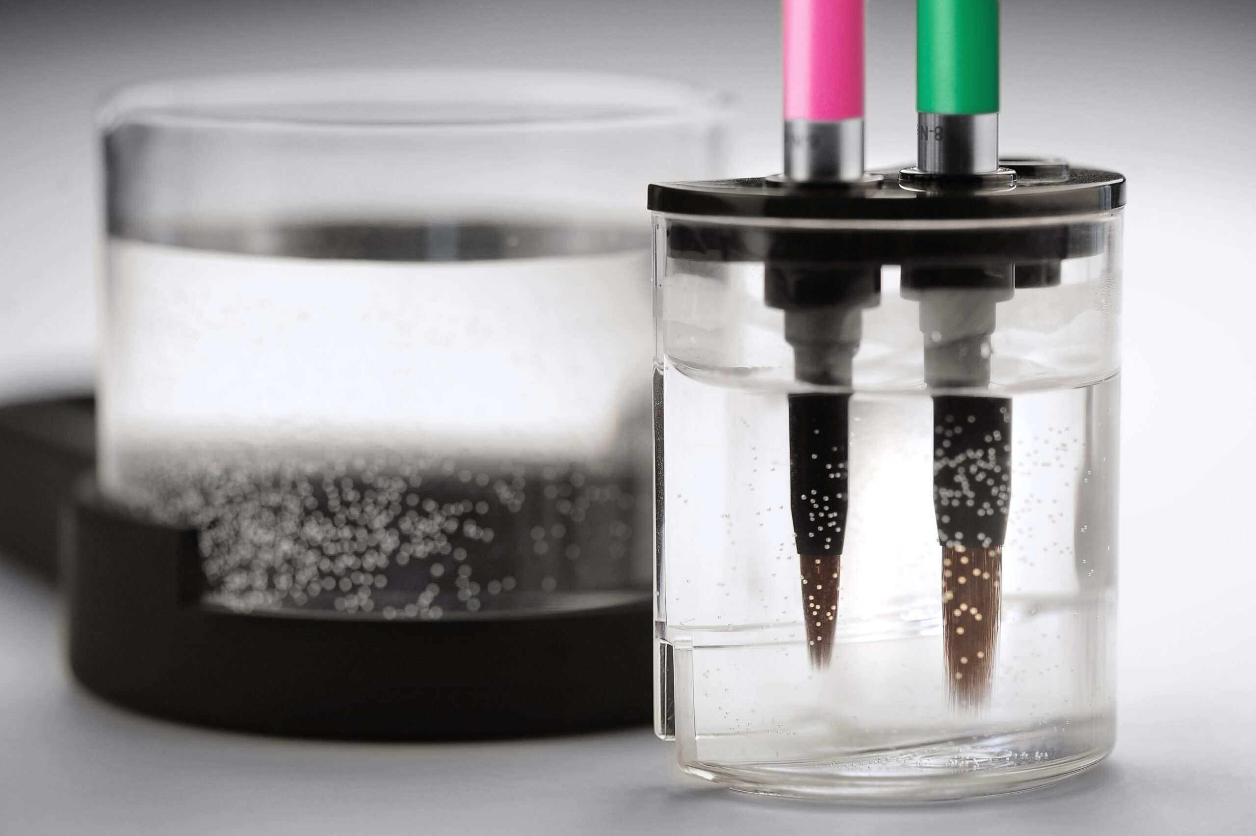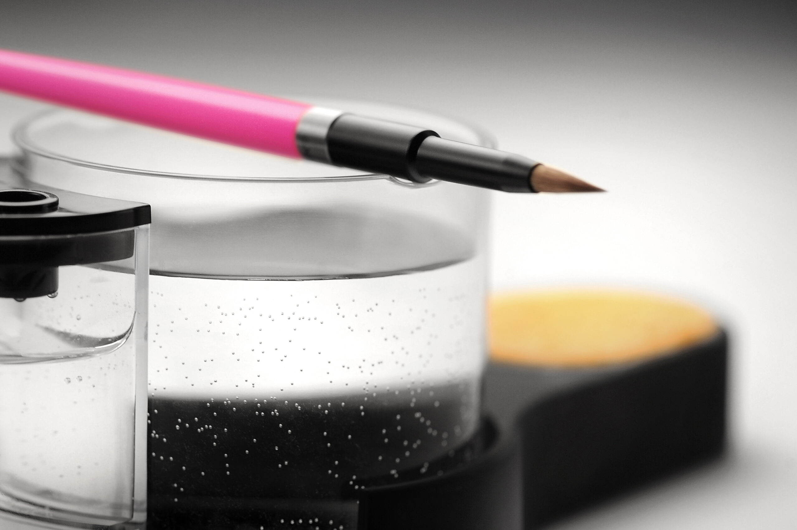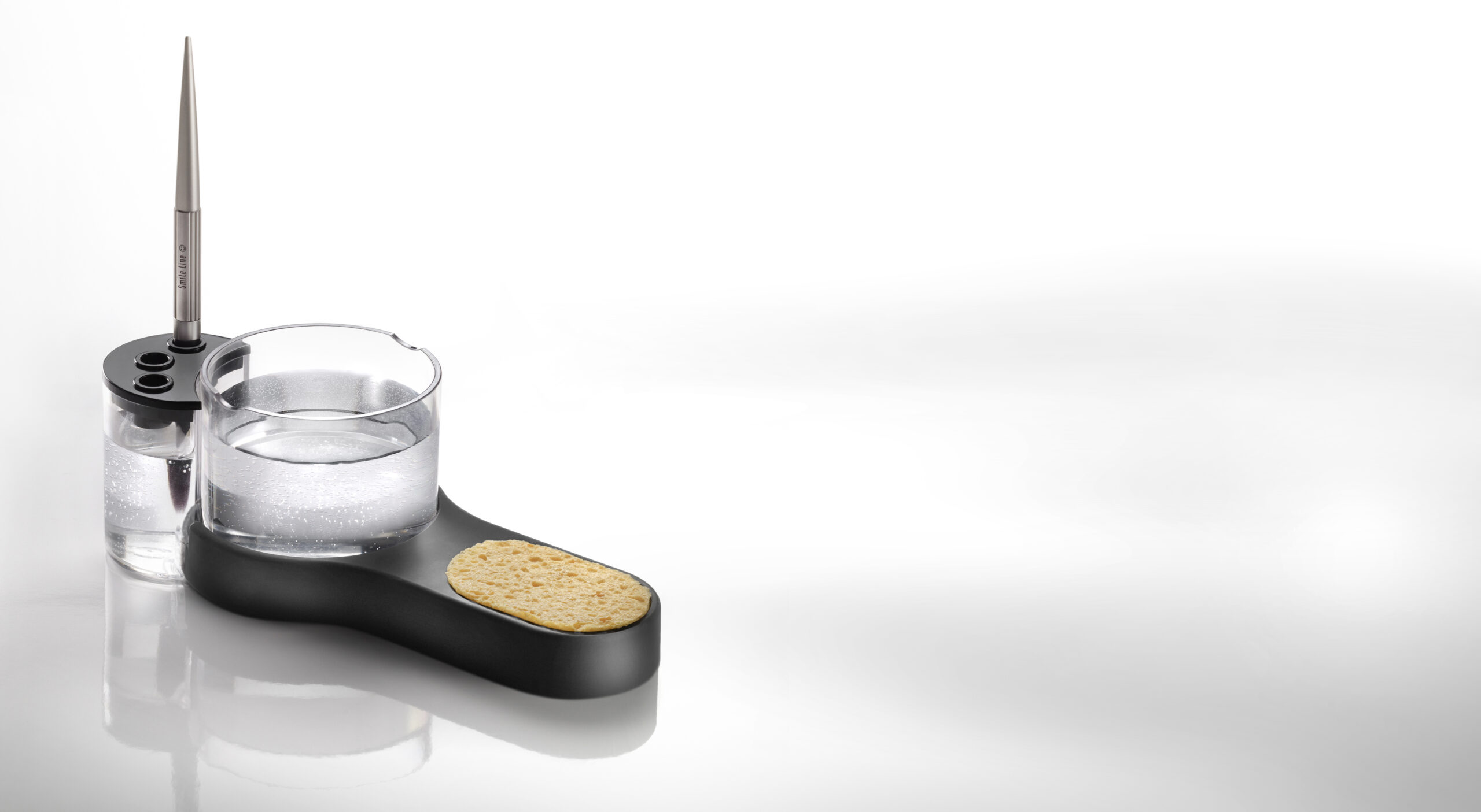 H2O, karıştırma tepsinizin sağında veya solunda bulunan porselen çalışma istasyonunuzu tamamlayan temel aksesuardır. Bu evrensel istasyon, fırçanızı tatlı suda durulamanıza, bir viskon sünger üzerinde mümkün olan en keskin ucu vermek için yumuşatmanıza ve son olarak bağımsız bir kapta dikey olarak suya batırılmış olarak saklamanıza olanak tanır. Tüm H2O bileşenleri bağımsızdır, bu da ana kabın suyunu saklama kabına dokunmak zorunda kalmadan değiştirebileceğiniz anlamına gelir… veya tam tersi. Tabanın tasarımı ve saklama kabının tutturulması sayesinde, tercihinize veya sol veya sağ elini kullanmanıza bağlı olarak konuma 60°’lik bir açıyla karar verebilirsiniz.